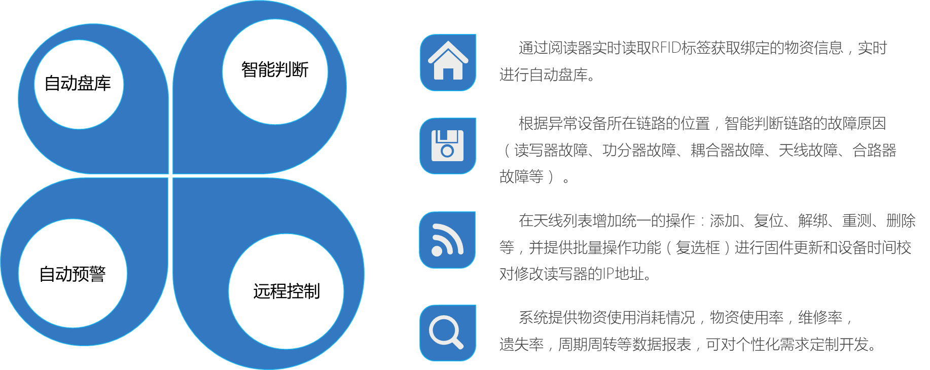 自動盤庫:通過RFID標簽信息讀取,自動識別和盤點室分資產(chǎn),實現(xiàn)室分資產(chǎn)無人化盤點,提高資產(chǎn)盤點效率。