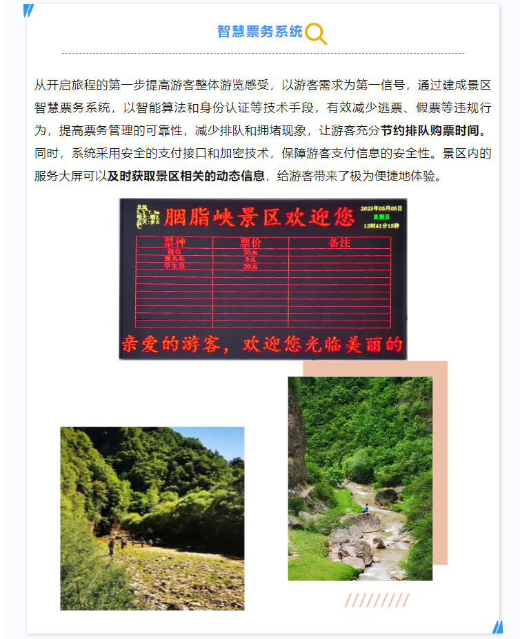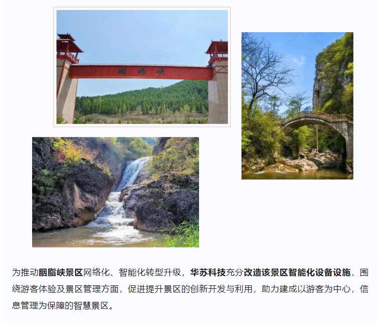 為推動(dòng)胭脂峽景區(qū)網(wǎng)絡(luò)化、智能化轉(zhuǎn)型升級(jí),華蘇科技 充分改造該景區(qū)智能化設(shè)備設(shè)施,圍繞游客體驗(yàn)及景區(qū)管理方面,