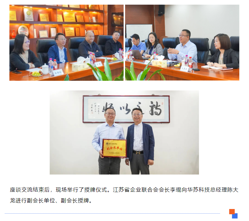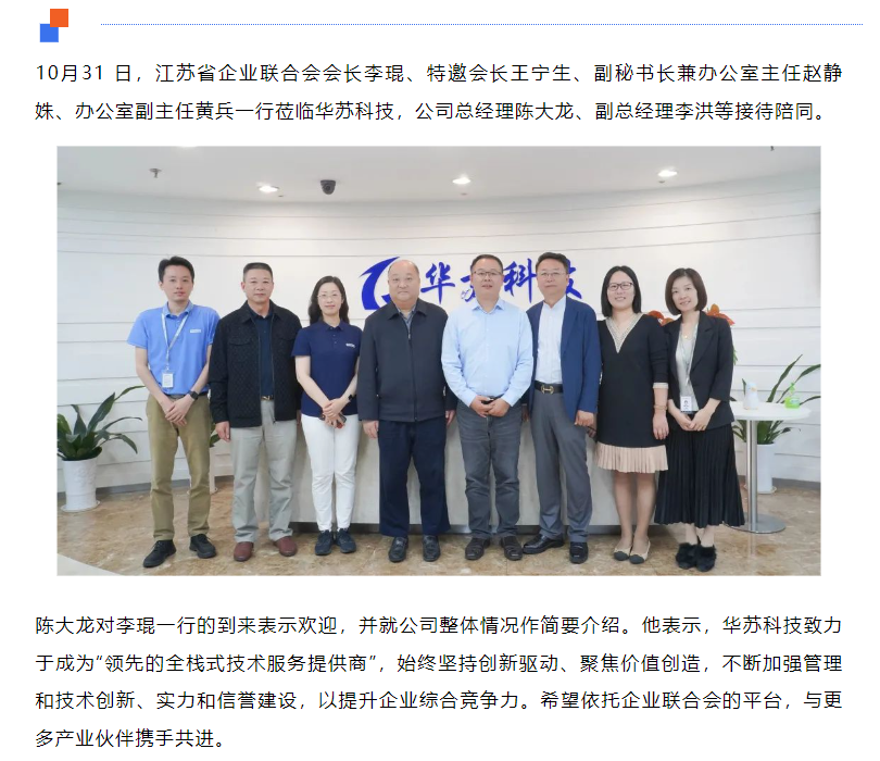 10月31 日,江蘇省企業(yè)聯(lián)合會會長李琨、特邀會長王寧生、副秘書長兼辦公室主任趙靜姝、辦公室副主任黃兵一行蒞臨華蘇科技 ,