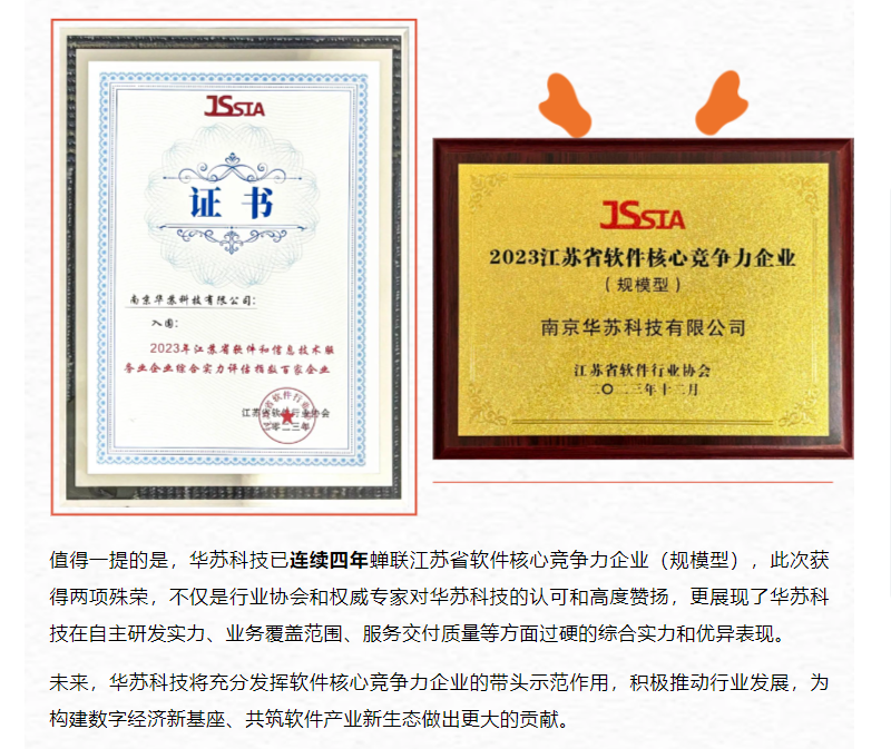 華蘇科技 憑借卓越實力獲得“2023江蘇省軟件核心競爭力企業(yè)(規(guī)模型)”