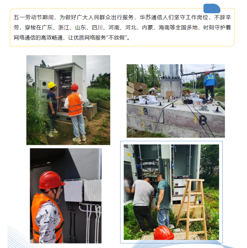 五一勞動(dòng)節(jié)期間,為做好廣大人民群眾出行服務(wù),華蘇通信人們堅(jiān)守工作崗位,不辭辛勞,穿梭在廣東、浙江、山東、四川、