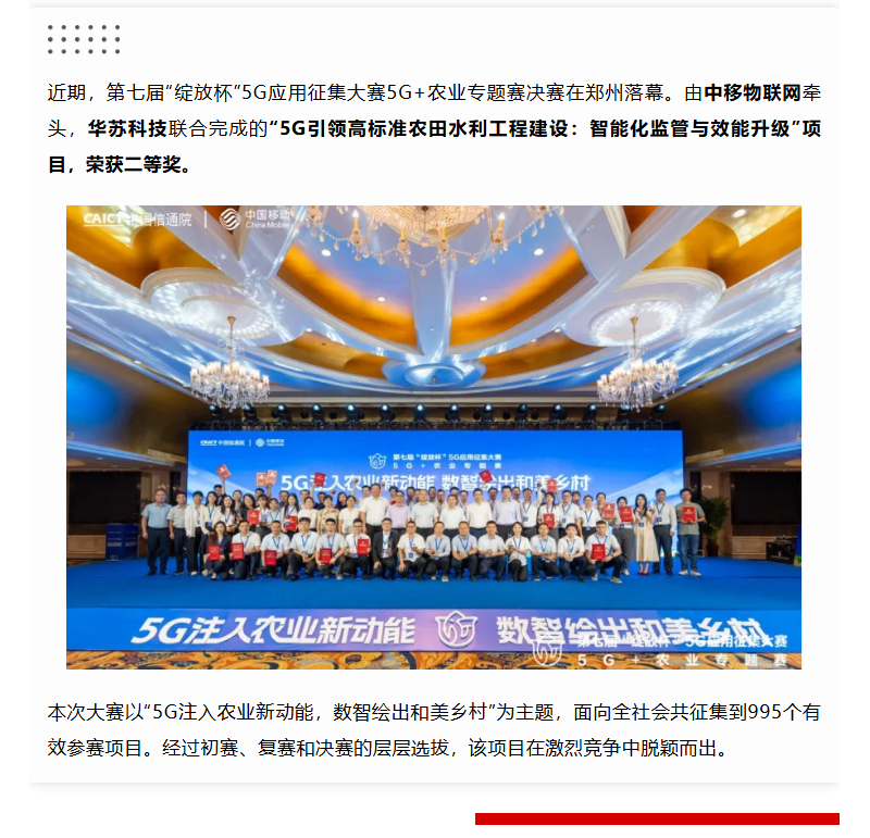 合力創(chuàng)佳績,華蘇科技榮獲第七屆“綻放杯”5G應(yīng)用征集大賽5G+農(nóng)業(yè)專題賽二等獎